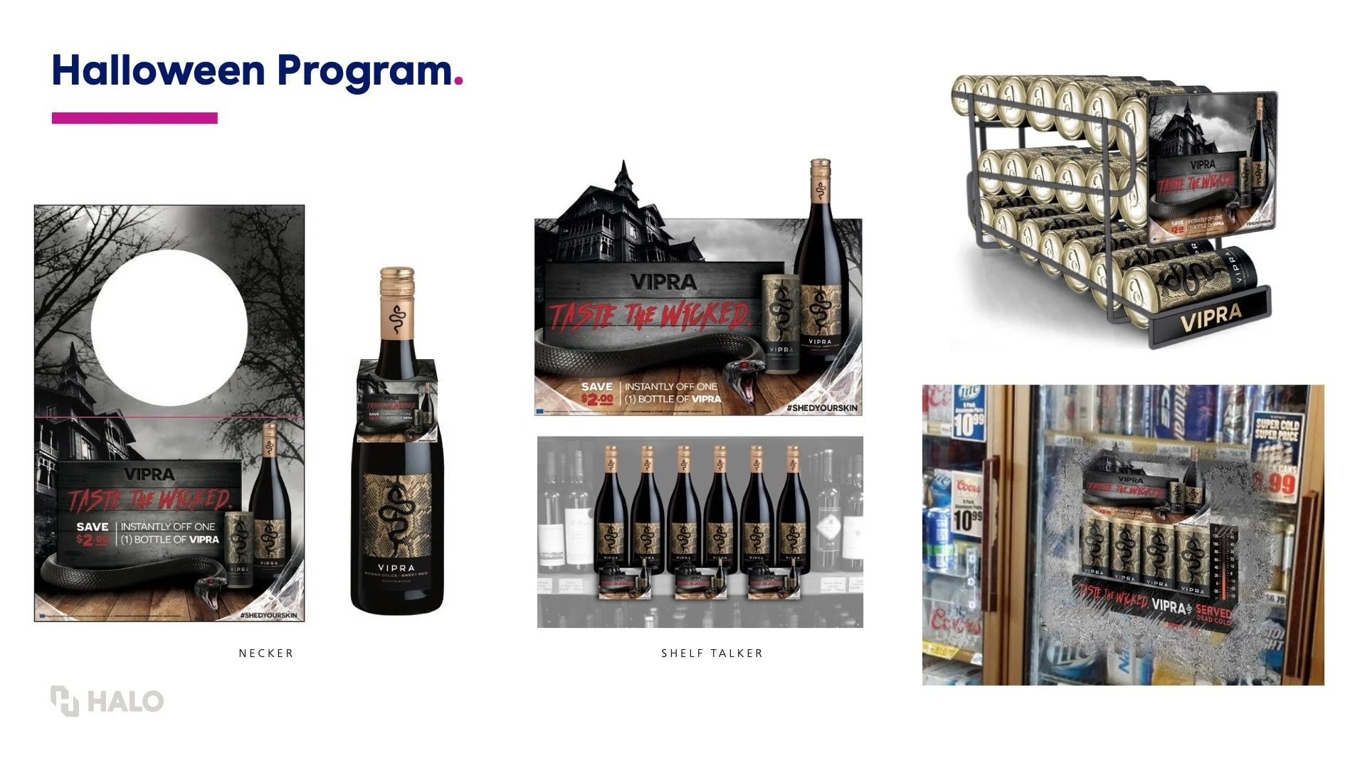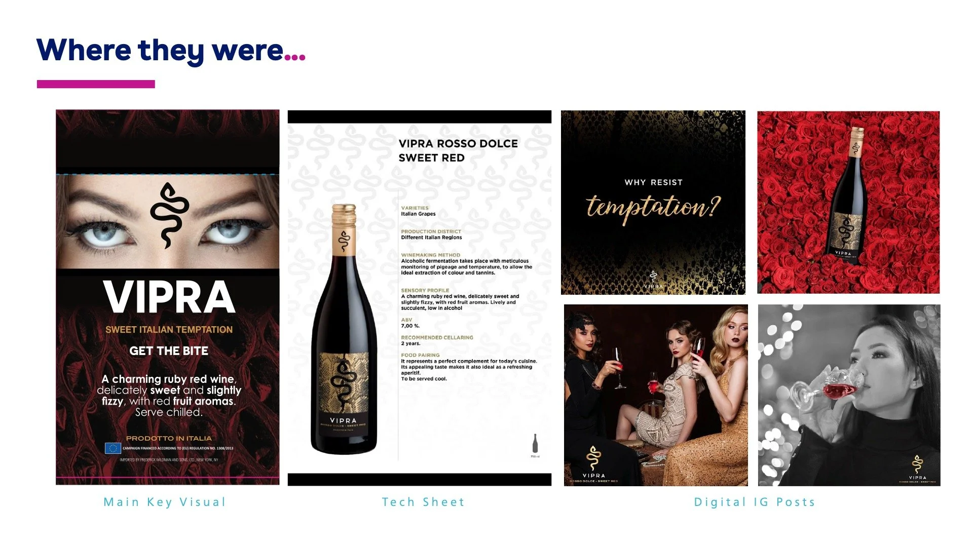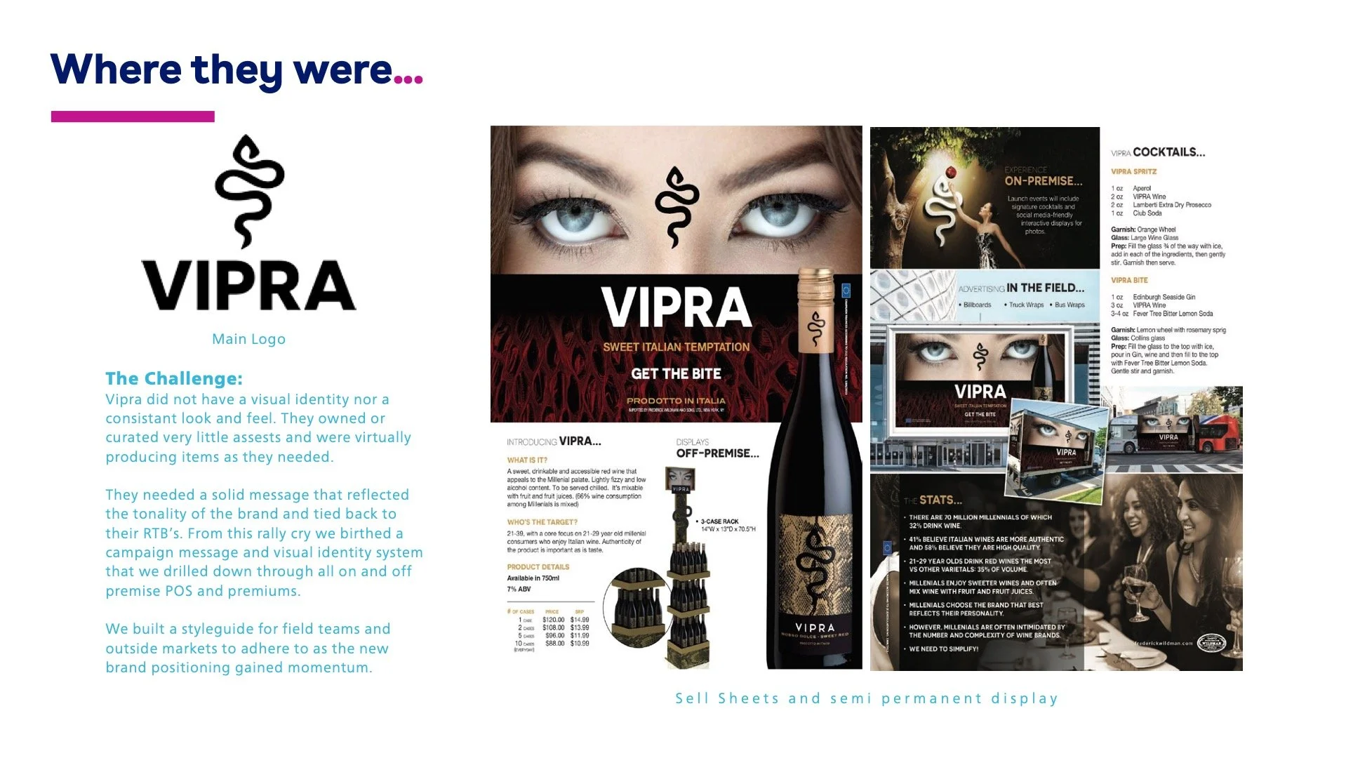 Frederick Wildman & Son’s has been a premier NYC wine & spirit importer since 1934. Their portfolio consists of 50+ wines from all over the globe and several spirits. We started working with them in 2018 and have grown our relationship ideating and delivering small ad hoc and seasonal display items to becoming their retained BTL agency of record. We have launched, revived and refreshed many well known brands on their roster including: Riunite, Bolla, Lamberti, VIPRA, Maschio and Chartreuse to name a few. Our First assignment was to relaunch a sparkling Italian red wine called VIPRA - They had very few assets, a logo and packaging. We needed to breath life into the brand, give it a voice and look. Once established we developed a tool kit and released it to the US.